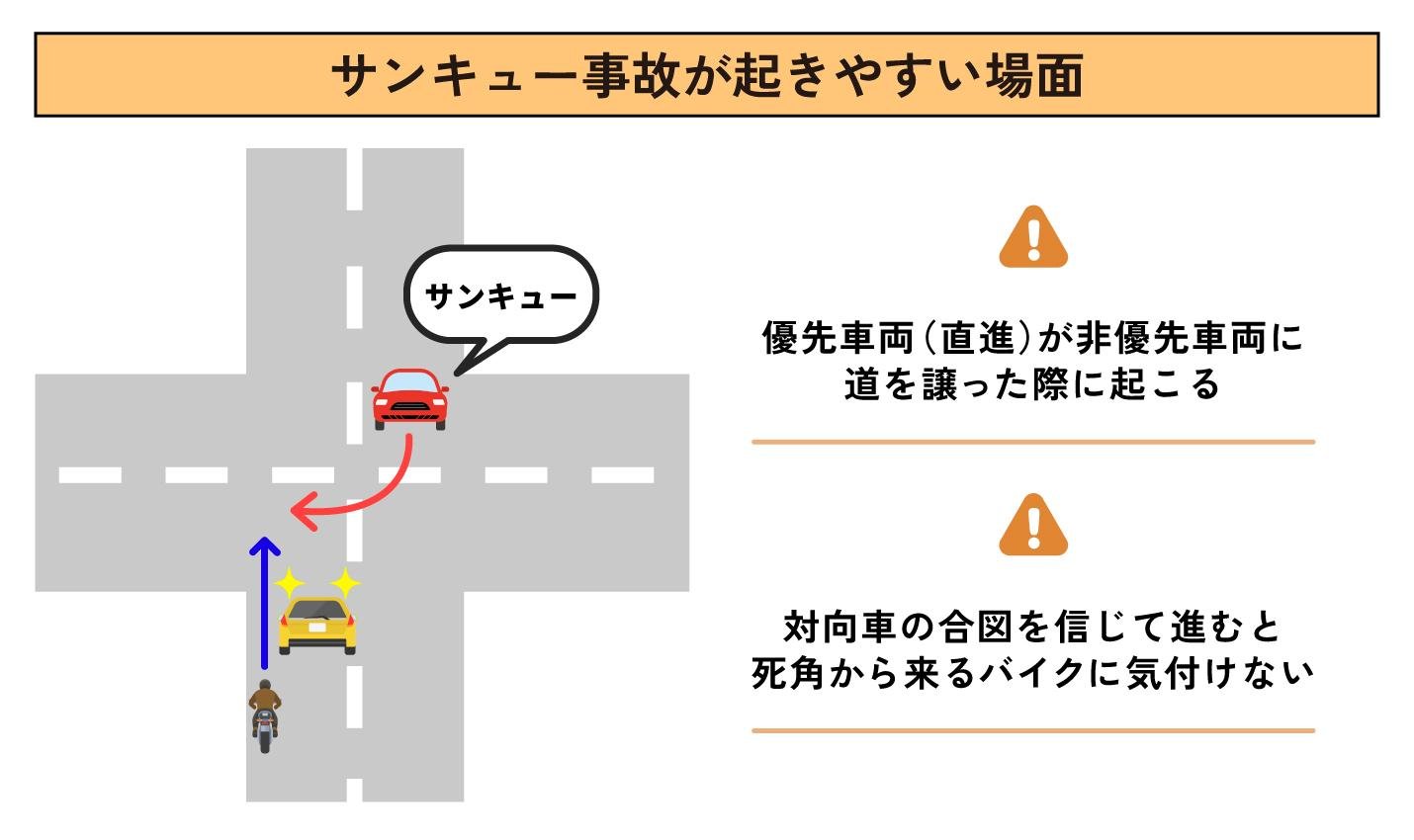 → 対応法: 譲られたからといって、交通ルール上の優先権は変わりません。対向車の死角からバイクなどが直進してくる「サンキュー事故」が起きやすいため、あくまで交通ルール上の優先権(直進優先)を意識し、周囲の安全を十分に確認してから慎重に進みましょう。
