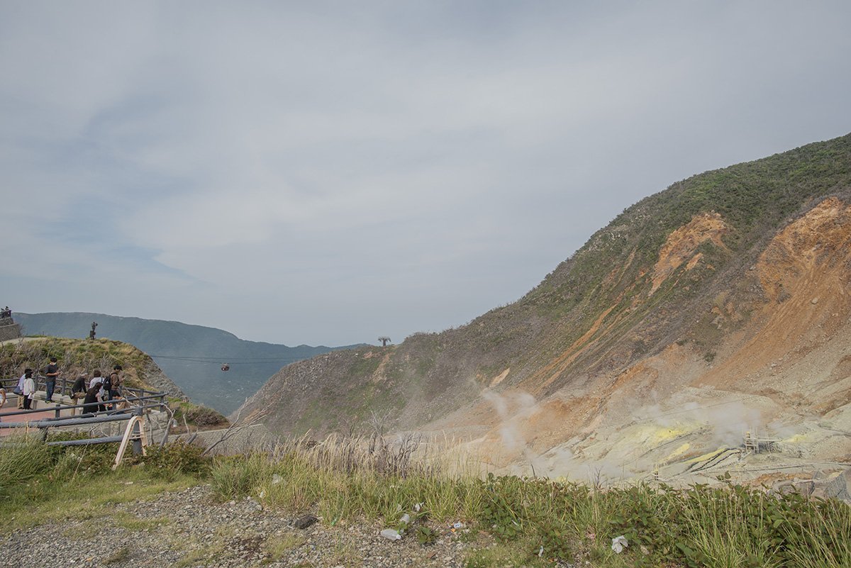 今も火山活動が続いているため、2016年9月より自然研究路は立ち入り規制中となっており、近くで見られる噴煙地は箱根ロープウェイ「大涌谷駅」の前。展望スペース「谷のテラス大涌谷」では谷の各所からもくもくと上がる白煙を柵越しに見られ、迫力満点です。